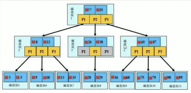 非叶子节点不存储真实数据,只存储指引搜索方向的数据项。比如最上面的节点,P1表示小于17的,P2表示大于17小于35的,P3表示大于35的。而注意,这里的17和35并不真实存在于数据表中。
