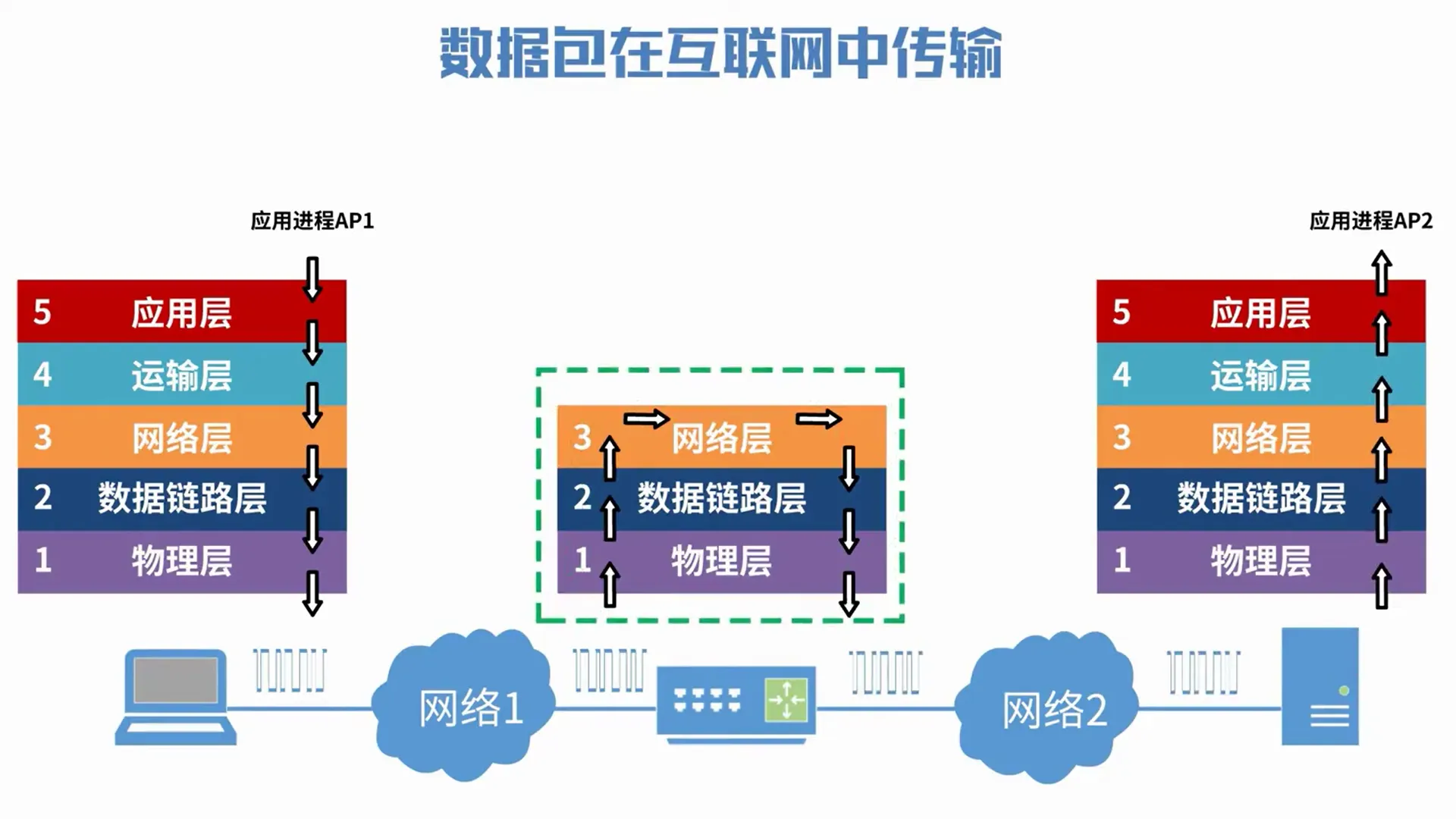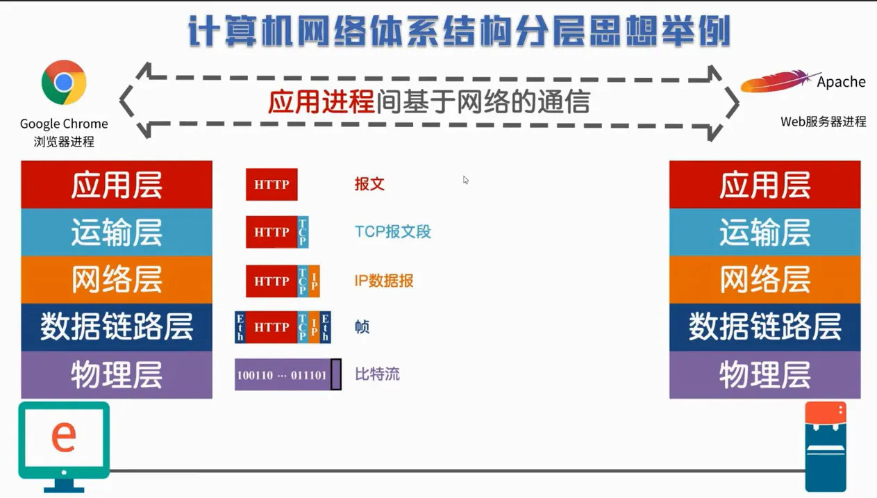 一台主机要访问一台服务器,也就是浏览器进程和服务器进程间的基于网络的通信,双方都要经过五层协议的处理。数据经过应用层到物理层,层层封包然后发送出去。接收方通过相反的过程(物理层到应用层)层层解封数据。