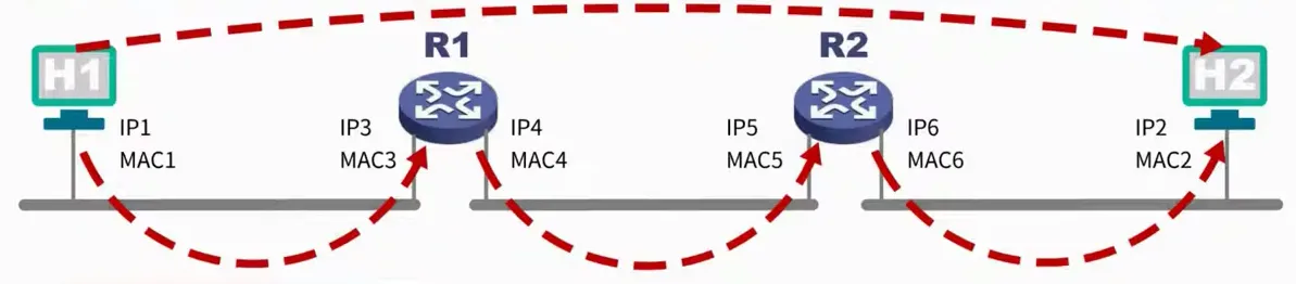 - 主机H1判断目的ip地址IP2与源ip地址IP1不在同一个网络,H1决定将数据包发送给H1所在网络的默认路由R1,并找到其IP地址为IP3。默认路由器,也常称为默认网关。