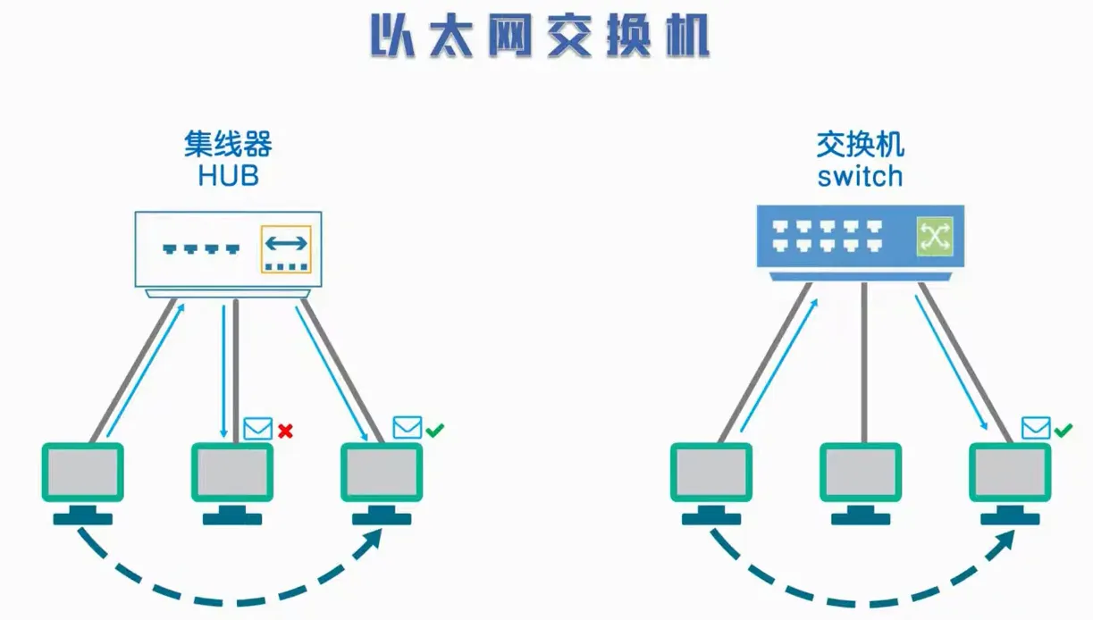 交换机通常有多个接口,每个接口都与一台主机或者另一个以太网的交换机相连。一般都工作在全双工方式,也就是收发帧可以同时进行。但是集线器的,逻辑上共享总线,使用CSMA/CD协议,只能工作在半双工方式。