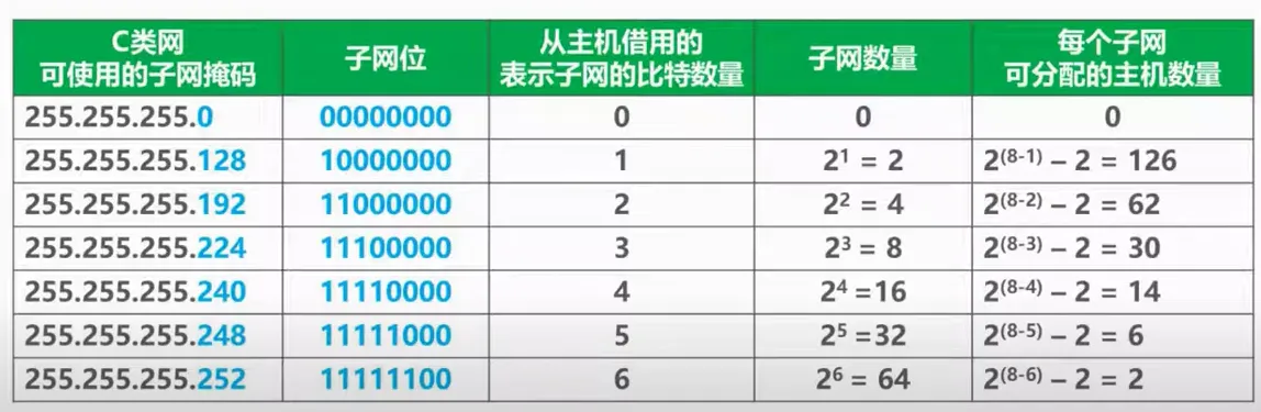 那c类网来说,当最后为0时,相当于没有划分子网。如果最后为128,也就是10000000,那么就有2个子网(0,1),对于每个子网,总共有7位可分配,所以总共有2的7次方个号码,然后去掉全0和全1,剩下就是2的7次方-2个可分配的主机数。因为全0为子网地址,全1为广播地址。