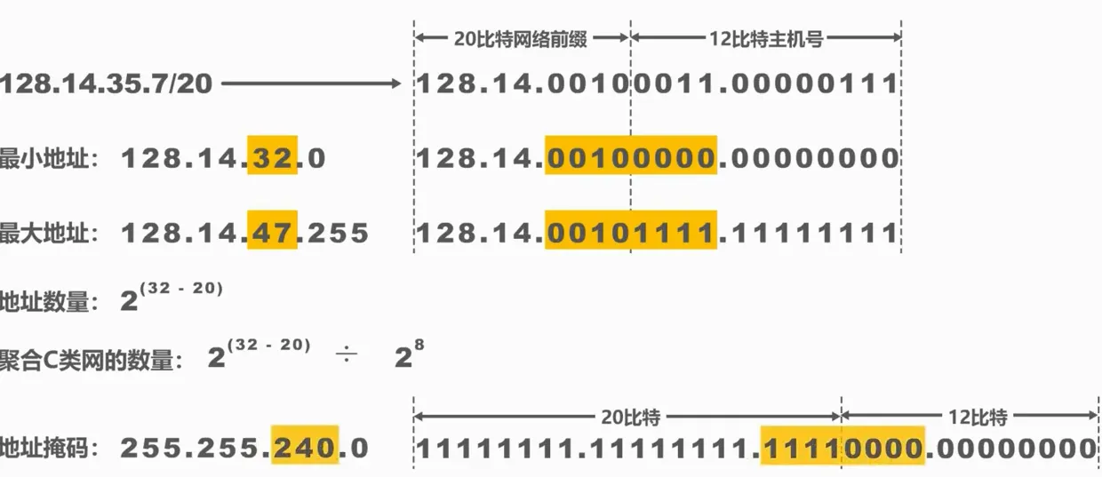 CIDR使用斜线记法,在斜线后面写上网络前缀所占的比特数量。比如128.21.22.3/20表示网络前缀占20比特,主机编号占用32-20=12位。